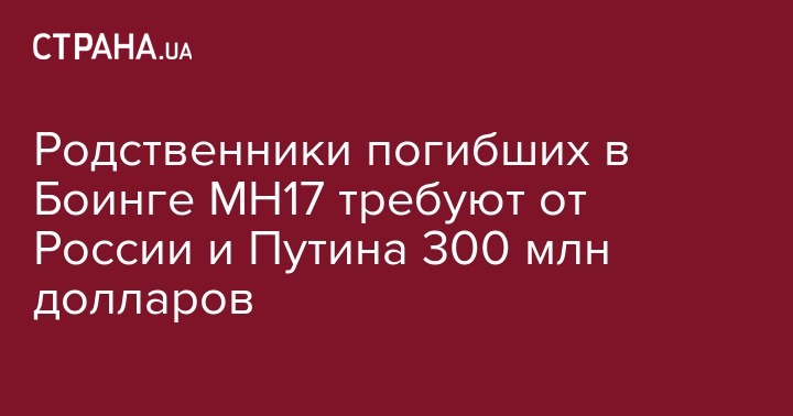 Родственники погибших в катастрофе малайзийского Boeing из Австралии, Малайзии и Новой Зеландии потребовали от России и лично от российского президента  Владимира Путина 330 млн долларов компенсации за моральный ущерб. Иск с этими требованиями в Европейский суд по правам человека подала австралийская юридическая фирма, передает Reuters.