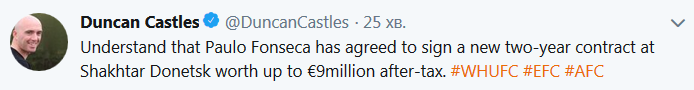 "Поймите, что Паулу Фонсека согласился подписать новый двухлетний контракт с донецким "Шахтером" стоимостью до 9 миллионов евро после уплаты налогов", - написал Дункан Кастлс.