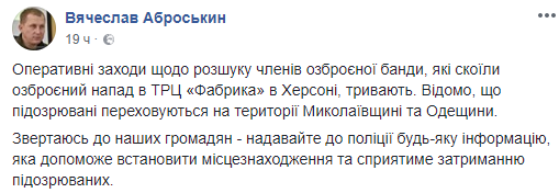 "Оперативные мероприятия по розыску членов вооруженной банды, совершивших вооруженное нападение в ТРЦ "Фабрика" в Херсоне продолжаются. Известно, что подозреваемые скрываются на территории Николаевской и Одесской областей", - сказано в сообщении.