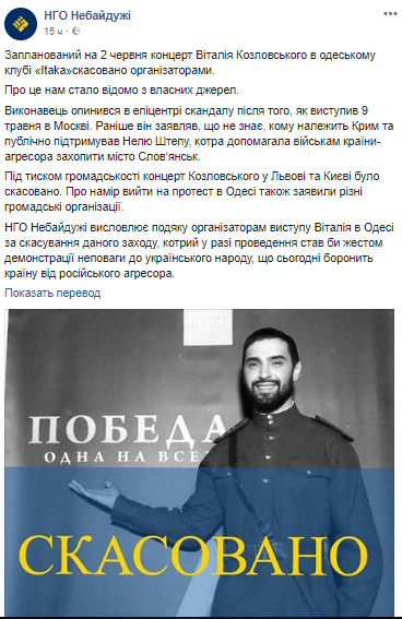 Организаторы одесского клуба "Itaka" отменили концерт Виталия Козловского, запланированный на 2 июня после того, как певец выступил в Москве на 9 мая.