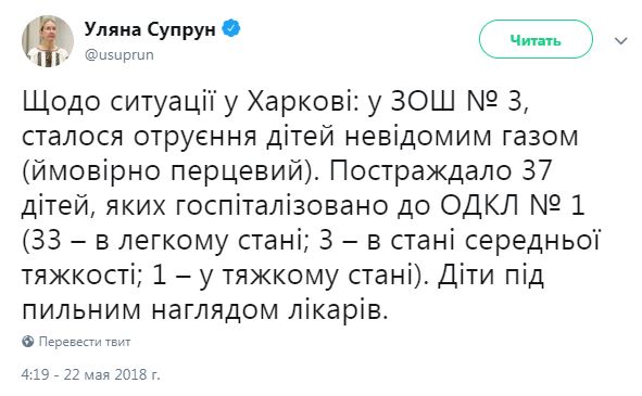 "О ситуации в Харькове: в СОШ № 3, произошло отравление детей неизвестным газом (вероятно перечный). Пострадало 37 детей, которые госпитализированы в ОДКБ № 1 (33 - в легком состоянии, 3 - в состоянии средней тяжести; 1 - в тяжелом состоянии). Дети под пристальным наблюдением врачей", - говорится в сообщении.