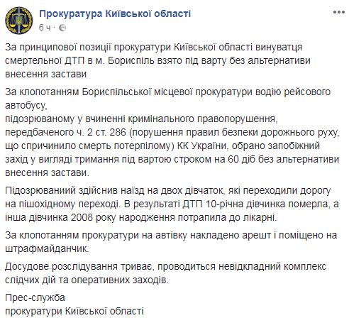 “Подозреваемый совершил наезд на двух девочек, которые переходили дорогу на пешеходном переходе. В результате ДТП 10-летняя девочка умерла, а другая девочка 2008 года рождения попала в больницу. По ходатайству Бориспольской местной прокуратуры водителю рейсового автобуса, подозреваемому в совершении уголовного правонарушения, предусмотренного ч. 2 ст. 286 (нарушение правил безопасности дорожного движения, повлекшее смерть потерпевшего) УК Украины, избрана мера пресечения в виде содержания под стражей сроком на 60 суток без альтернативы внесения залога", - говорится в опубликованном сообщении.