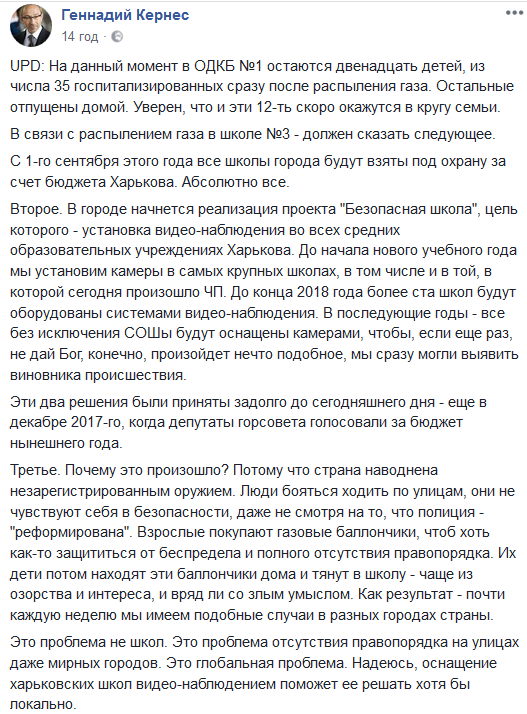 Это проблема не школ. Это проблема отсутствия правопорядка на улицах даже мирных городов. Это глобальная проблема. Надеюсь, оснащение харьковских школ видео-наблюдением поможет ее решать хотя бы локально", - написал Кернес.