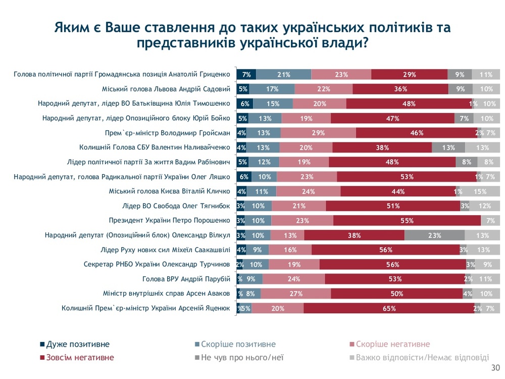 Наверху списка симпатий украинцев - Анатолий Гриценко (28%), Андрей Садовой (22%), Юлия Тимошенко (21%) и Юрий Бойко (18%).