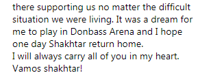 Наконец, хочу сказать спасибо всем болельщикам, потому что вы всегда поддерживали нас независимо от того, в какой сложной ситуации мы жили. Сыграть на "Донбасс-Арене" было для меня мечтой и я надеюсь, что "Шахтер" однажды вернется домой", – написал он у себя в Instagram.