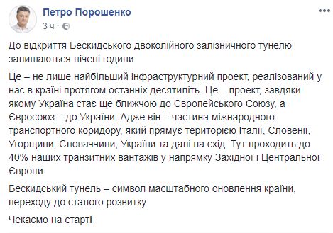 Президент Петр Порошенко заявил, что на примере Бескидского тоннеля видно, что "наши строители возвращаются в Украину". Учитывая, что компания строила тоннель с 2013 года и никуда из Украины образно говоря "не уходила", то заявление президента смотрится чересчур оптимистично.