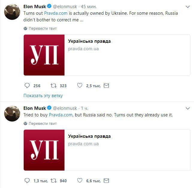 "Попробовал приобрести Pravda.com, но Россия сказала нет. Оказывается, они уже его используют", - говорится в сообщении на аккаунте миллиардера в Твиттер в пятницу. При этом адрес pravda.com перенаправляет запросы на сайт "Украинской правды" (то есть, по словам Маска получается, что Россия использует сайт УП).