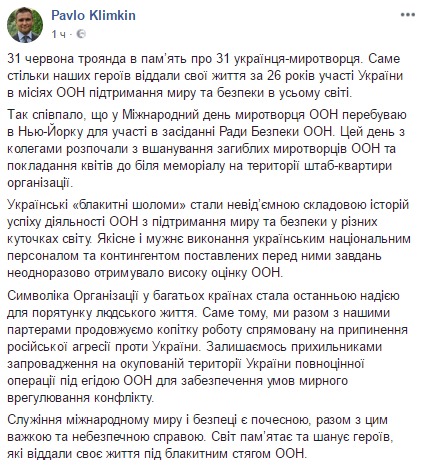 "Символика Организации (ООН - Прим.Ред) во многих странах стала последней надеждой для спасения человеческой жизни. Именно поэтому мы вместе с нашими партнерами продолжаем кропотливую работу, направленную на прекращение российской агрессии против Украины. Остаемся сторонниками введения на оккупированную территорию Украины полноценной операции под эгидой ООН для обеспечения условий мирного урегулирования конфликта", - написал глава МИД на странице в Facebook во вторник.