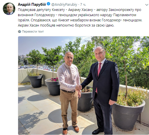 "Поблагодарил депутата Кнессета - Акрама Хасана - автора законопроекта о признании Голодомора - геноцидом украинского народа парламентом Израиля. Надеюсь, что Кнессет вскоре признает Голодомор- геноцидом. Акрам Хасан пообещал стойко бороться за свою идею" - говорится в сообщении.