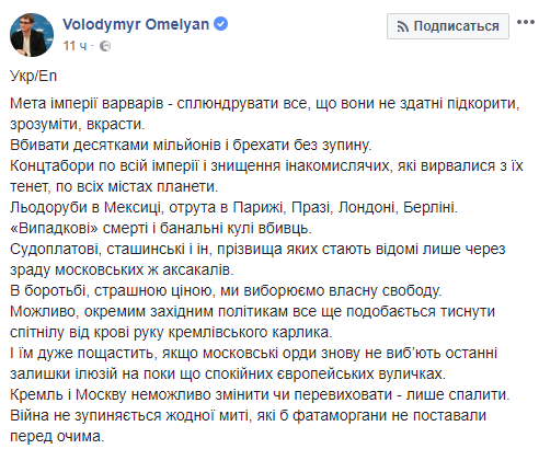 "Возможно, отдельным западным политикам все еще нравится пожимать вспотевшую от крови руку кремлевского карлика. И им очень повезет, если московские орды опять не выбьют последние остатки иллюзий на пока спокойных европейских улочках. Кремль и Москву невозможно изменить или перевоспитать - только сжечь", - написал министр.