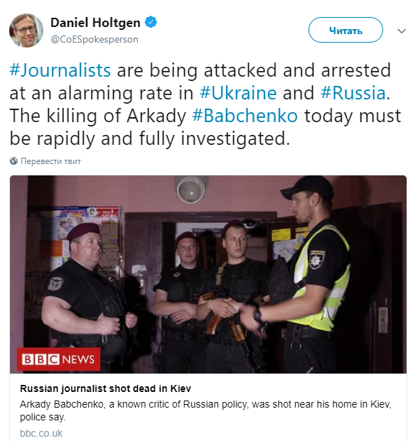 "В Украине и России журналисты подвергаются нападениям и арестам с тревожной скоростью. Убийство Аркадия Бабченко должно быть расследовано быстро и в полной мере", - написал спикер генсека Совета Европы Даниэль Хольтген написал на своей странице в Twitter.