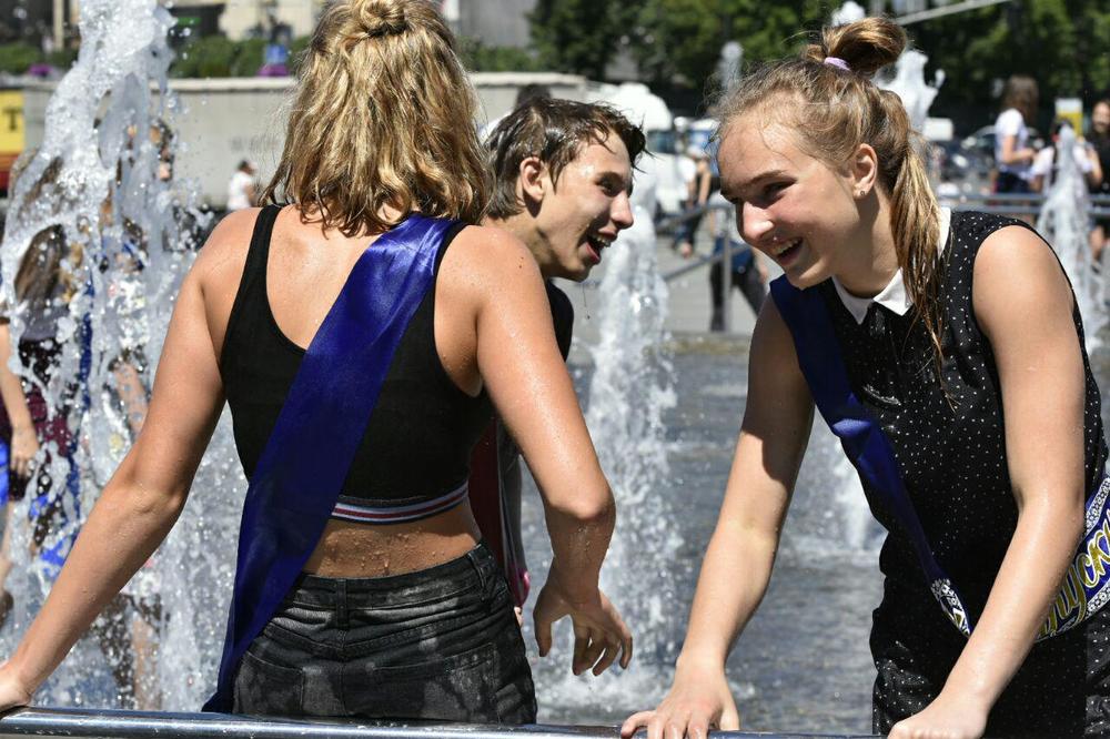 Фотокорреспонденты "Страны" посмотрели, как по традиции в последний учебный день школьники купаются в фонтанах на Майдане Независимости.