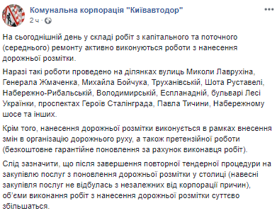 Следует отметить, что после завершения повторной тендерной процедуры на закупку услуг по восстановлению дорожной разметки в столице (весной закупка услуг не состоялась по независящим от корпорации причинам), объемы выполнения работ по нанесению дорожной разметки существенно увеличатся", - говорится в сообщении.