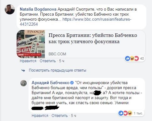 "Дорогая пресса Британии! А иди, пожалуйста, на@уй, а? А хотите пользы - дайте мне британский паспорт и защиту. Вот тогда и будете меня учить, как спасть свою семью. Умники х@евы, б@ядь", - написал он в комментариях к своему посту в ответ на ссылку на статью в СМИ Великобритании.