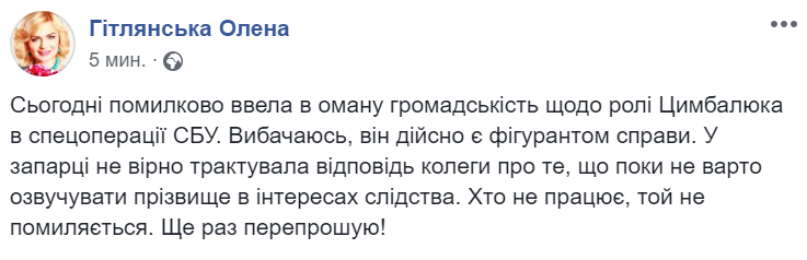 21:35 Спикер СБУ Елена Гитлянская, которая ранее отрицала, что Цимбалюк - провокатор и "киллер Бабченко", теперь это признала.