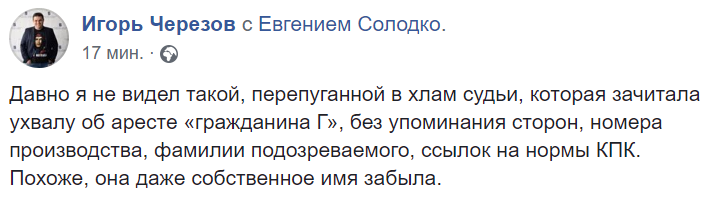22:43 "Давно я не видел такой, перепуганной в хлам судьи, которая зачитала ухвалу об аресте "гражданина Г", без упоминания сторон, номера производства, фамилии подозреваемого, ссылок на нормы КПК.