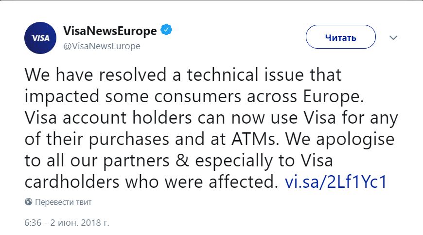 "Мы решили техническую проблему, которая повлияла на потребителей по всей Европе. Держатели счетов теперь могут использовать карты Visa для любой из своих покупок и в банкоматах. Мы приносим свои извинения всем нашим партнерам и особенно держателям карт Visa, которых коснулась эта проблема", - говорится в сообщении.