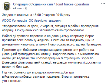 В субботу, 2 июня, в результате боевых действий трое украинских военнослужащих получили ранения. Об этом сообщает пресс-центр Операции объединенных сил в Facebook.