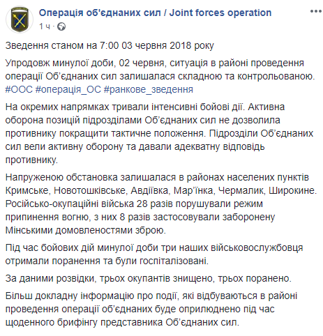 Об этом сообщает пресс-центр ООС на своей странице в Facebook.