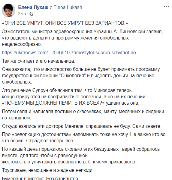 "Я уже давно привык к цинизму украинских чиновников. Но то, что заявил Линчевский, это действительно страшно. А еще страшнее, что это позиция целого министерства. Супрун неоднократно заявляла о намерениях прекратить финансирование онкобольных украинцев. Все это можно охарактеризовать одним единственным словом - геноцид", - пишет юрист Михаил Шнайдер.