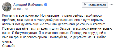 "Коллеги, я все понимаю. Но поверьте - у меня сейчас такой ворох проблем, мне нужно в очередной раз жизнь заново с нуля строить, чтобы я мог думать еще и о том, как делать вам рейтинги и контент. Поэтому давайте так: пятьдесят штук баксов - и эксклюзивное интервью ваше. Я безумно устал. Я выжат полностью. Последние пару дней я был на грани нервного срыва. Пожалуйста, не дергайте меня. Дайте ожить. Спасибо", - написал он.