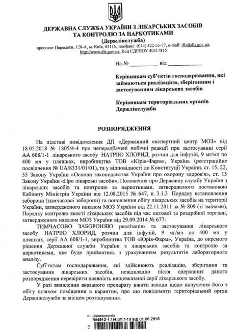 Временно запретили реализацию и применение препарата "Натрия хлорид" (раствор для инфузий, 9 мг/мл по 400 мл в бутылках, серия АА 608/1-1, производство ООО "Юрія-Фарм") из-за непредсказуемых побочных реакциях.