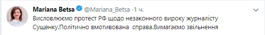 "Выражаем протест РФ относительно незаконного приговора журналисту Сущенко. Политически мотивированное дело. Требуем освобождения", - написала спикер МИД Марьяна Беца на своей странице в twitter в понедельник.