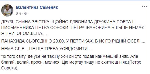 "Друзья, печальная весть. Только что звонила жена поэта и писателя Петра Ивановича Сороки. Петра Ивановича больше нет. Панихида состоится сегодня в 20:00 в его родном селе Петрики", - говорится в сообщении.