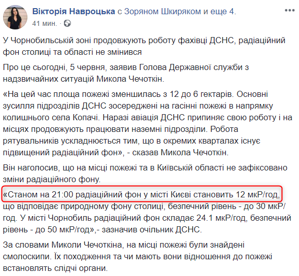 Так, к 17:00 вторника, 5 мая в Киеве сообщалось о 10 микрорентген в час. А в уже в 21:00 руководитель ГосЧС заявил о 12-ти мкР/час.