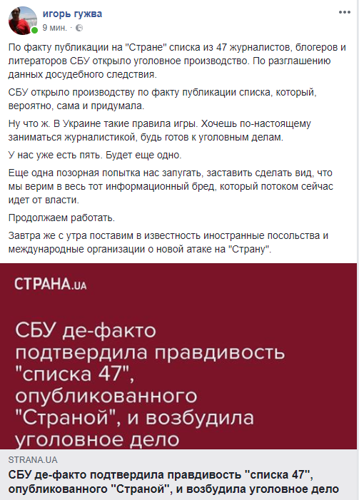 "СБУ открыла производству по факту публикации списка, который, вероятно, сама и придумала. Ну что ж. В Украине такие правила игры. Хочешь по-настоящему заниматься журналистикой, будь готов к уголовным делам, - написал Игорь Гужва на своей странице в Facebook. - У нас уже есть пять. Будет еще одно. Еще одна позорная попытка нас запугать, заставить сделать вид, что мы верим в весь тот информационный бред, который потоком сейчас идет от власти. Продолжаем работать".
