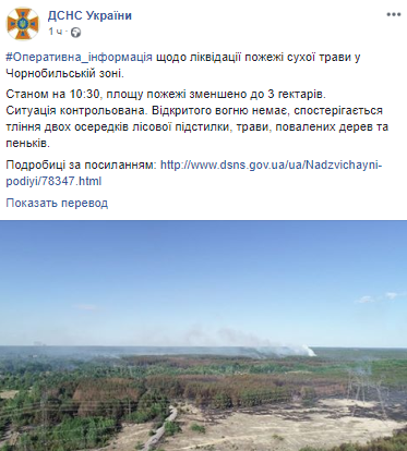 В зоне отчуждения Чернобыльской АЭС (Киевская обл.) по состоянию на 10:30 среды продолжается ликвидация отдельных очагов пожара на общей площади около 3 га. При этом, открытого огня нет. Об этом Госслужба по чрезвычайным ситуациям сообщает на своей странице в Facebook.