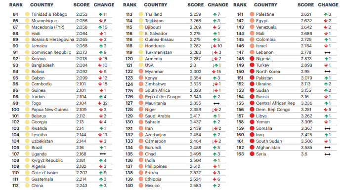 В рейтинге наиболее миролюбивых стран мира в Глобальном индексе миролюбия (Global Peace Index) Украина заняла 152-е место из 163-х.