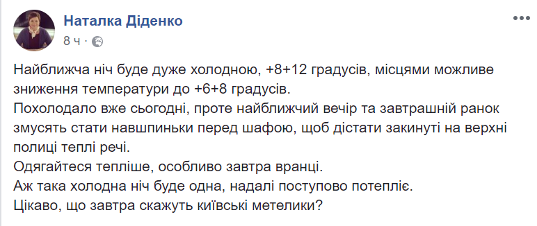 "Похолодало уже сегодня, однако ближайший вечер и завтрашнее утро заставят встать на цыпочки перед шкафом, чтобы достать заброшеные на верхние полки теплые вещи. Одевайтесь теплее, особенно завтра утром. Даже такая холодная ночь будет одна, в дальнейшем постепенно потеплеет. Интересно, что завтра скажут киевские бабочки?", задается вопросом Диденко.