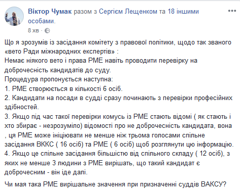 "Что я понял из заседания Комитета по правовой политике, по так называемому "вето Совета международных экспертов". Нет никакого вето и права СМЭ даже проводить проверку на добродетель кандидатов в суд.