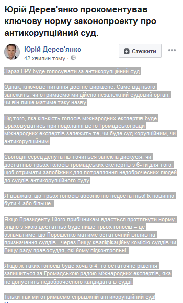"На текущий момент по результатам ночных переговоров компромисс вокруг законопроекта об Антикоррупционном суде выглядит следующим образом.