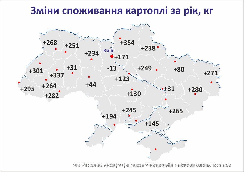 Он пишет, что пятерка лидеров по увеличению потребления картофеля за год выглядит следующим образом: Черниговская область +354 кг, Тернопольская +337 кг, Днепропетровская +317 кг, Львовская +301 кг, Закарпатская область +295 кг.