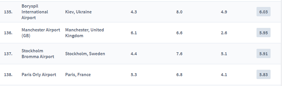 Согласно результатам исследования, "Борисполь" оказался на 135 из 141 отметки в рейтинге, обойдя лишь аэропорт Манчестера и Станстед в Британии, шведский Стокгольм-Бромма, Париж-Орли и Лионский аэропорт имени Сент-Экзюпери во Франции, а также Международный аэропорт Кувейта.