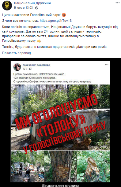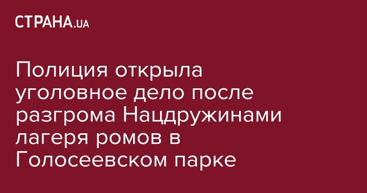 Киевская полиция открыла уголовное производство по факту разгрома представителями  "Национальных дружин" поселения ромов в Голосеевском парке Киева. Об этом сообщается на сайте Нацполиции Киева.