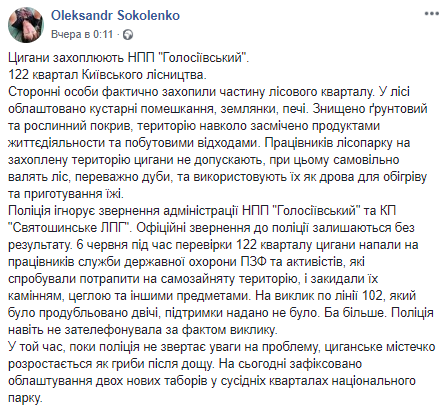 Поводом для сюжета стал размещенный в соцсети пост сотрудника национального парка "Голосеевский" Александра Соколенко, который рассказал, что поселенцы уничтожают почвенный и растительный покров, засоряют территорию вокруг  продуктами жизнедеятельности и бытовыми отходами.
