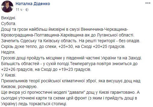 "Сторонников теории российского климатической оружия, которое высушивает дождь над Киевом, разочарую. Еще вчера все прогностические модели "давали" дождь в Киеве гарантировано. А сегодня уточненные карты и схемы показывают, что этот фронт (с которым и придут дожди в Украину) едва касается столицы. Вряд ли подлый заговор российских преступных климатологов был бы осуществлен всего за сутки с немцами, американцами, британцами и многими европейскими метеоцентрами", - написала синоптик Наталья Диденко в Facebook.