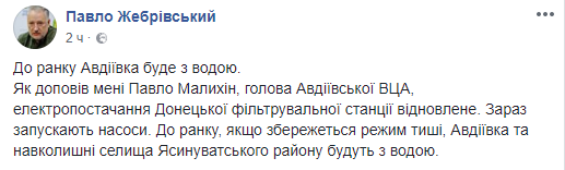 "К утру Авдеевка будет с водой. Как доложил мне Павел Малыхин, глава Авдеевской военно-гражданской администрации, электроснабжение Донецкой фильтровальной станции восстановлено. Сейчас запускают насосы", - написал Жебривский.