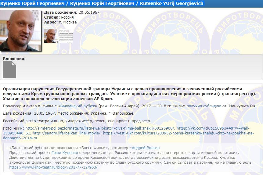 Известный российский актер театра и кино Гоша Куценко попал в базу сайта "Миротворец" по обвинению в организации нарушения государственной границы Украины. Об этом сказано на сайте организации.
