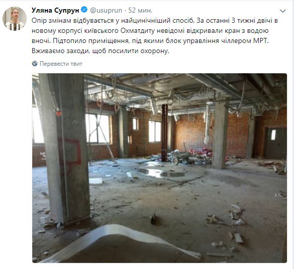 "За последние 3 недели дважды в новом корпусе киевского Охматдета неизвестные открывали кран с водой ночью. Подтопило помещения, под которыми блок управления чиллером МРТ", - написала Супрун.