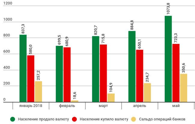 По данным НБУ, в мае банки купили у населения наличной валюты на сумму $1,074 млрд, что является рекордным показателем с 2015 года. А продали населению валюты на $723,3 млн. Это рекордный показатель с декабря 2017 года.