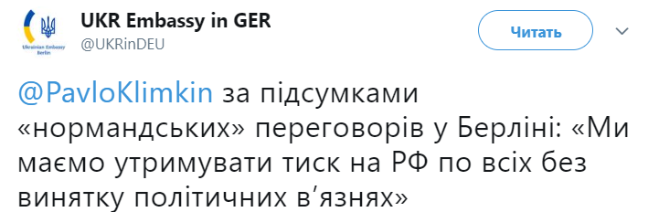 "Мы должны продолжать давление на РФ по всем без исключения политическим заключенным", – цитирует Климкина Twitter украинского МИД.
