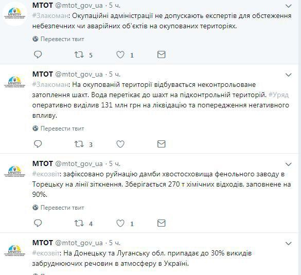 "На оккупированной территории происходит неконтролируемое затопление шахт. Вода перетекает к шахтам на подконтрольной территории. Правительство оперативно выделило 131 млн грн на ликвидацию и предупреждение негативного воздействия", — говорится в сообщении МинВОТ.