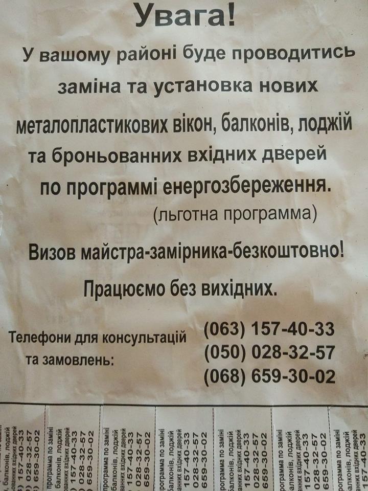 В столице появились объявления о замене и установке металлопластиковых окон, балконов и дверей по льготной программе. Однако доверять таким объявлениям не стоит – их развешивают мошенники.