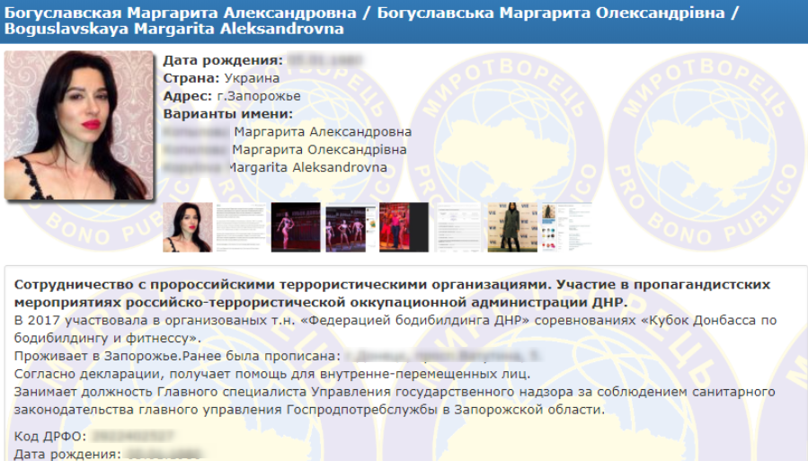 На сайте Миротворец в разделе Чистилище появилась информация о запорожской чиновнице Маргарите Богуславской, которая в 2017 году приняла участие в соревнованиях по бодибилдингу под эгидой "федерации" самопровозглашенной ДНР.