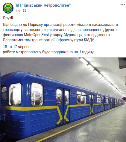 "В соответствии с Порядком организации работы городского пассажирского транспорта общего пользования во время проведения Второго фестиваля MotoOpenFest в парке Муромец, утвержденного Департаментом транспортной инфраструктуры КГГА, 16 и 17 июня работа метрополитена будет продлена на 1 час", - говорится  в сообщении.