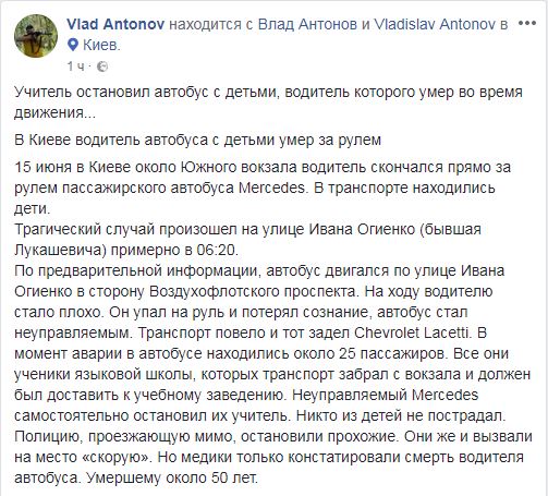 Сегодня, 15 июня в Соломенском районе Киева водитель автобуса с детьми умер за рулем, а неуправляемый Mercedes остановил учитель.